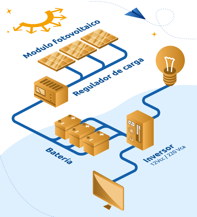 ¿Cuáles son los componentes que forman un kit solar de conexión aislada? En este artículo vamos a hablar de los diferentes elementos que componen un kit solar de aislada, es decir, un kit solar que no está conectado a la red y que será la única fuente de energía para nuestra casa, dispositivos… Los elementos básicos de un kit solar de aislada son: